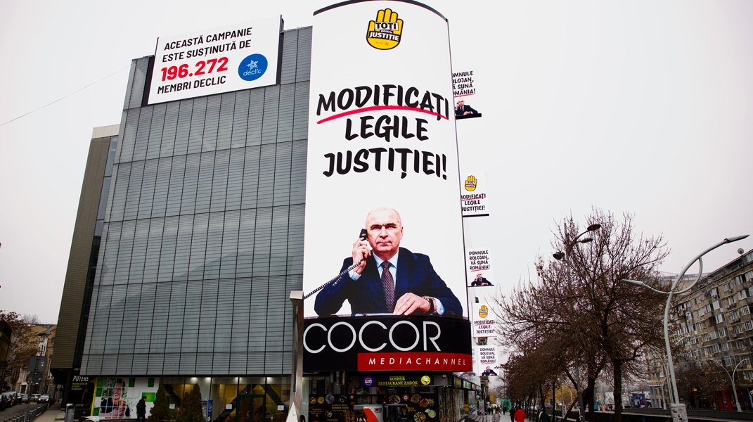 Un banner imens, care îl reprezintă pe premierul Bolojan și conține mesajul „Modificați legile justiției”, a fost poziționat pe fațada unui magazin Cocor din București, anunțat de comunitatea Declic sâmbătă. Petiția pentru schimbarea legislației din justiție a strâns deja peste 200.000 de semnături. În context, premierul Ilie Bolojan a anunțat crearea unui grup de lucru pentru analizarea legislației din justiție, ca urmare a scandalului recent din sistemul judiciar.
