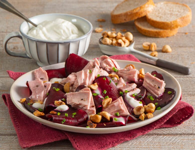 Imaginea arată o farfurie cu un preparat din sfeclă crudă, ton, iaurt și alune prăjite.